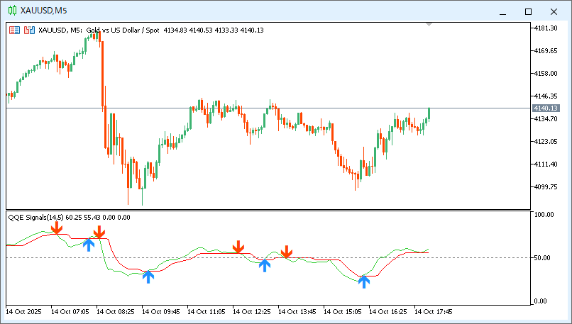 「QQE_Signals」は、このQQEのロジックに基づき、売買シグナルをサブウィンドウに矢印で表示するインジケーターです。シグナル発生時には、ポップアップやサウンドによるアラート通知機能も搭載しています。