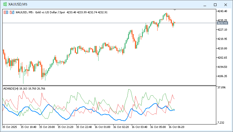 特徴: このインジケーターは、TradingViewなどで標準的に採用されているワイルダー氏オリジナルの計算方法(Wilder’s Smoothing / RMA)を使用しています。MT5標準のADXとは計算方法が若干異なるため、より多くのトレーダーが利用する指標と互換性があります。
